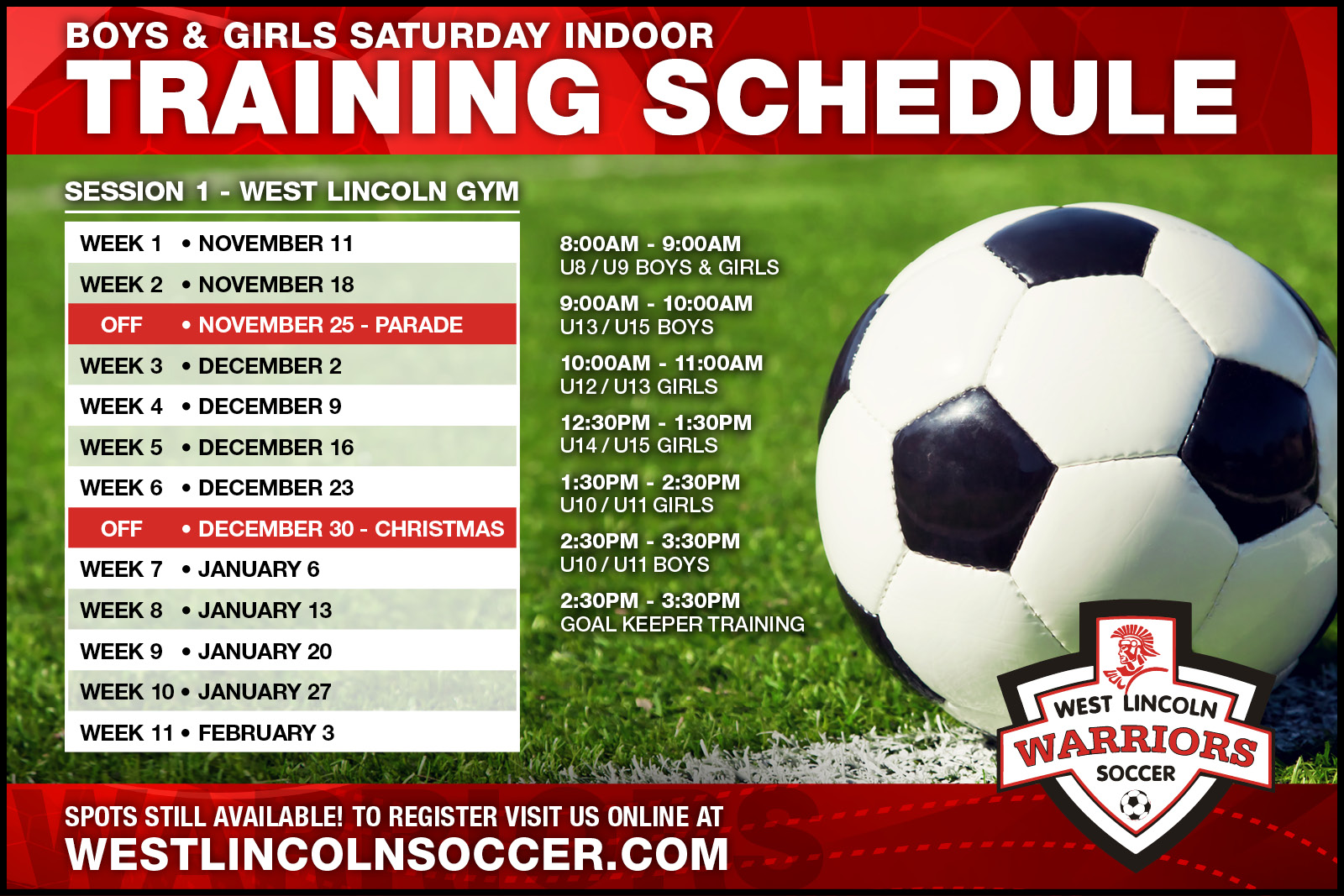 Boys & Girls Saturday Indoor Training Schedule - Session 1